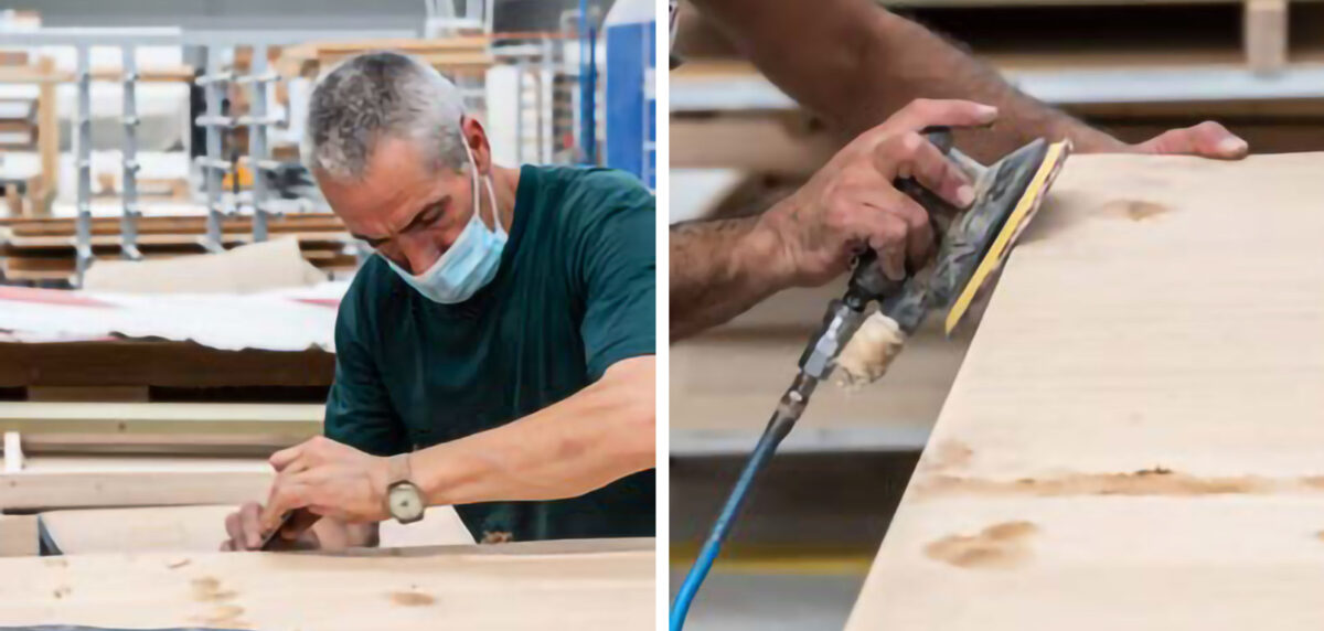 L’aspect est naturel, le bois laissé en apparence quasi brut, chaque pièce est poncée et finie à la main de l’artisan. La légèreté des portants, des feuilles de métal pliées et découpées, rajeunit la ligne et allège l’ensemble.