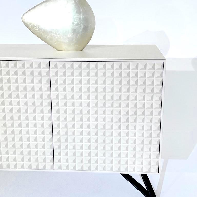 Près de mille petites pyramides aux pointes polies s’alignent sur ses portes. Ce motif hypnotique aux multiples facettes donne au meuble un caractère résolument design.
