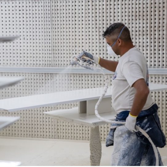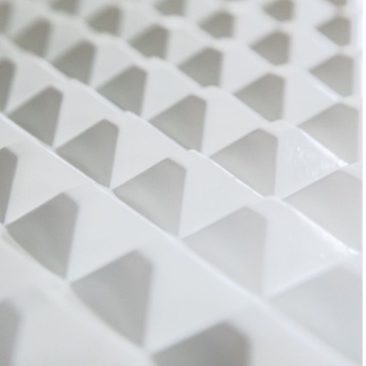 Des objets de décoration aux lignes douces et minimalistes souligneront l’effet kaléidoscopique de PYRAA. Un lampadaire arrondi, un tapis aux motifs discrets, harmoniseront l’ensemble en laissant toute la force de caractère de cette ambiance s’exprimer.