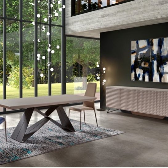 La table à manger suit cette inspiration par son piètement entrecroisé et triangulaire.