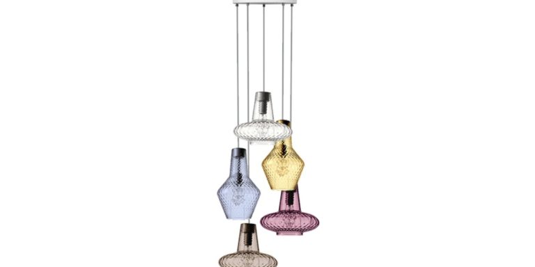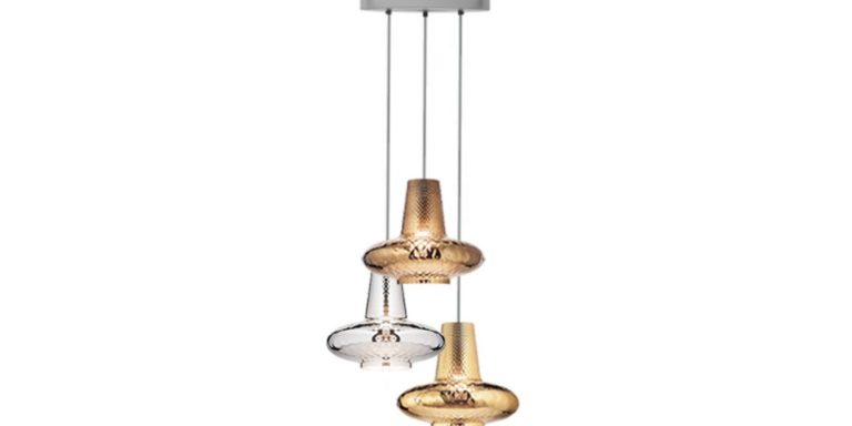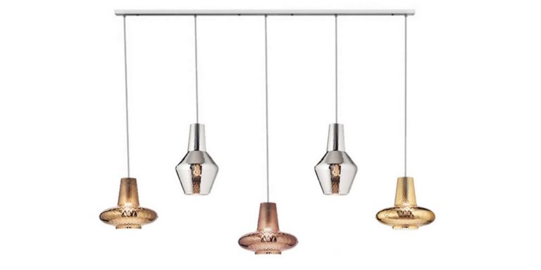 Des suspensions qui associent quatre à cinq sources lumineuses colorées, et un éclairage adouci par le verre à facettes de lampes d’Aladin.